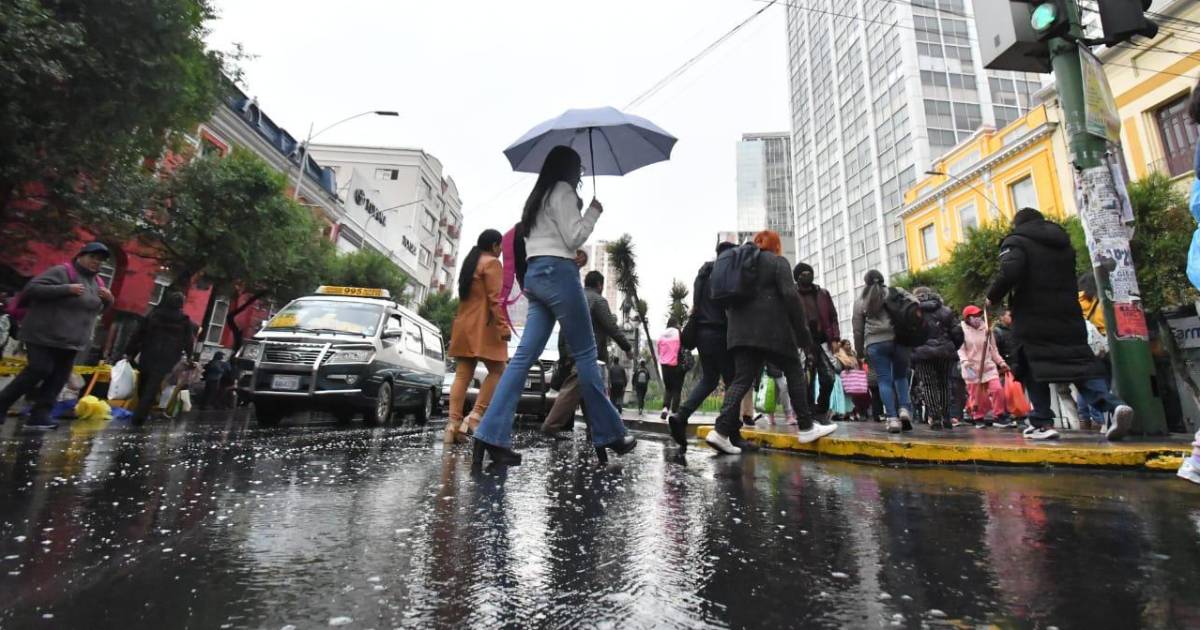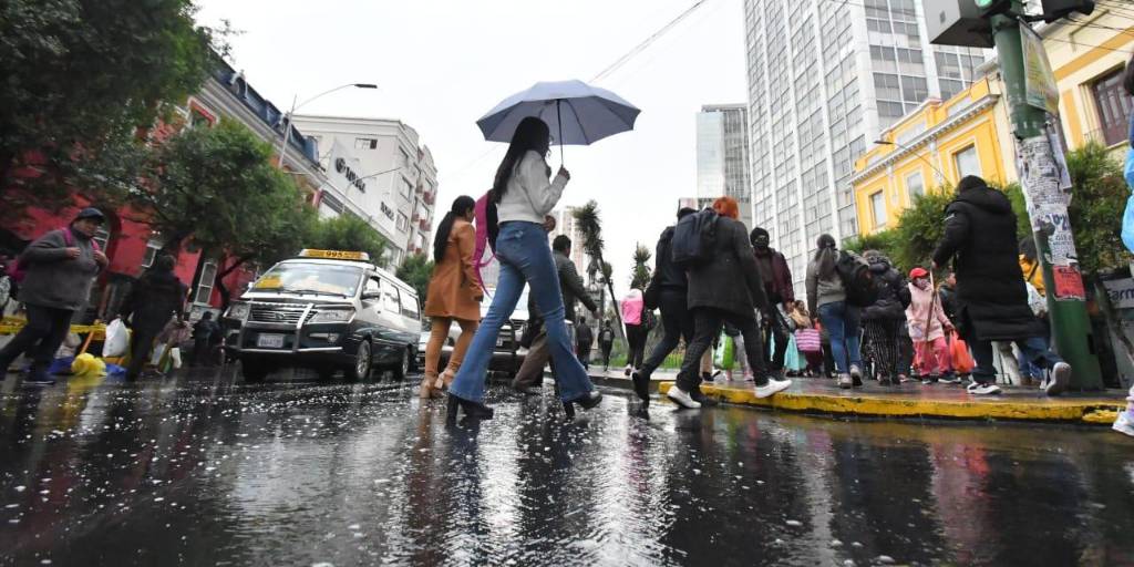 En la ciudad de La Paz, la lluvia comenzó pasado el mediodía y se prolongó hasta la tarde de este jueves. Los paceños tuvieron que desempolvar los paraguas para salir a las calles tras la persistente lluvia.