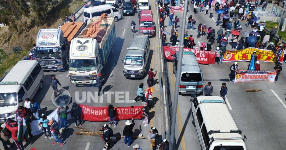 De acuerdo a las imágenes, las delegaciones de los maestros de Santa Cruz y Cochabamba, se apostaron en ambas vías para impedir la libre circulación de los vehículos particulares, minibuses y buses del servicio interdepartamental.