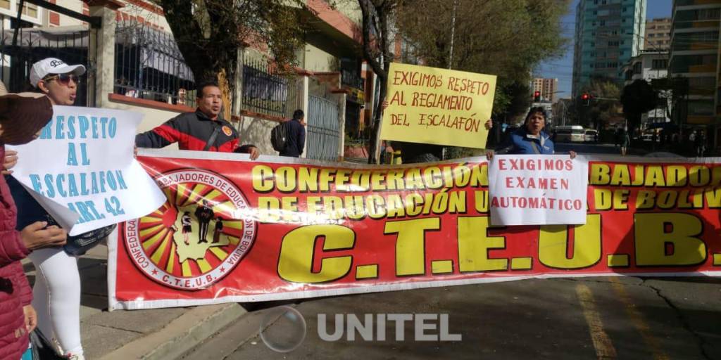 Dirigentes nacionales del magisterio urbano bloquearon la mañana de este lunes la avenida Arce, en el ingreso al Ministerio de Educación, para exigir ascenso automático de categoría y respeto al escalafón.