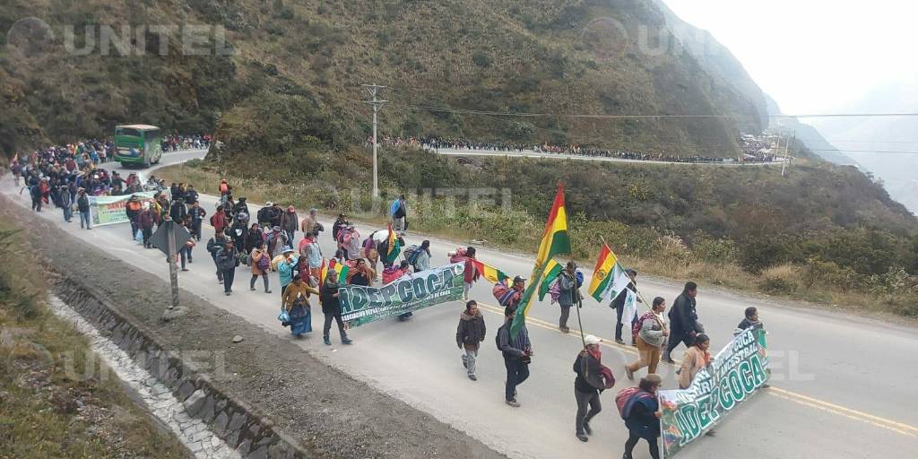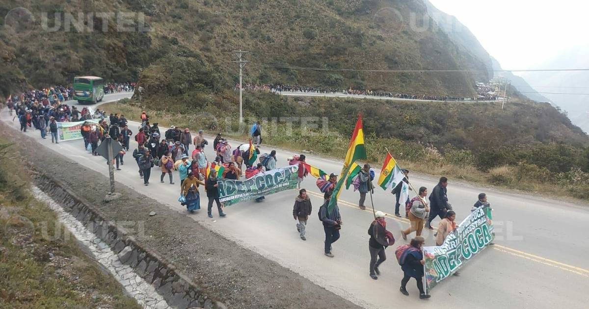 Los cocaleros de Adepcoca que llegaron de varias regiones de los Yungas de La Paz retomaron su caminata para descender desde la zona de Urujara con dirección a la calle 1 de Villa El Carmen en donde pretenden cerrar el mercado paralelo de la coca.