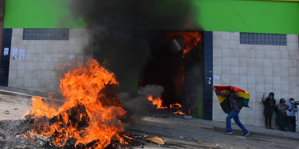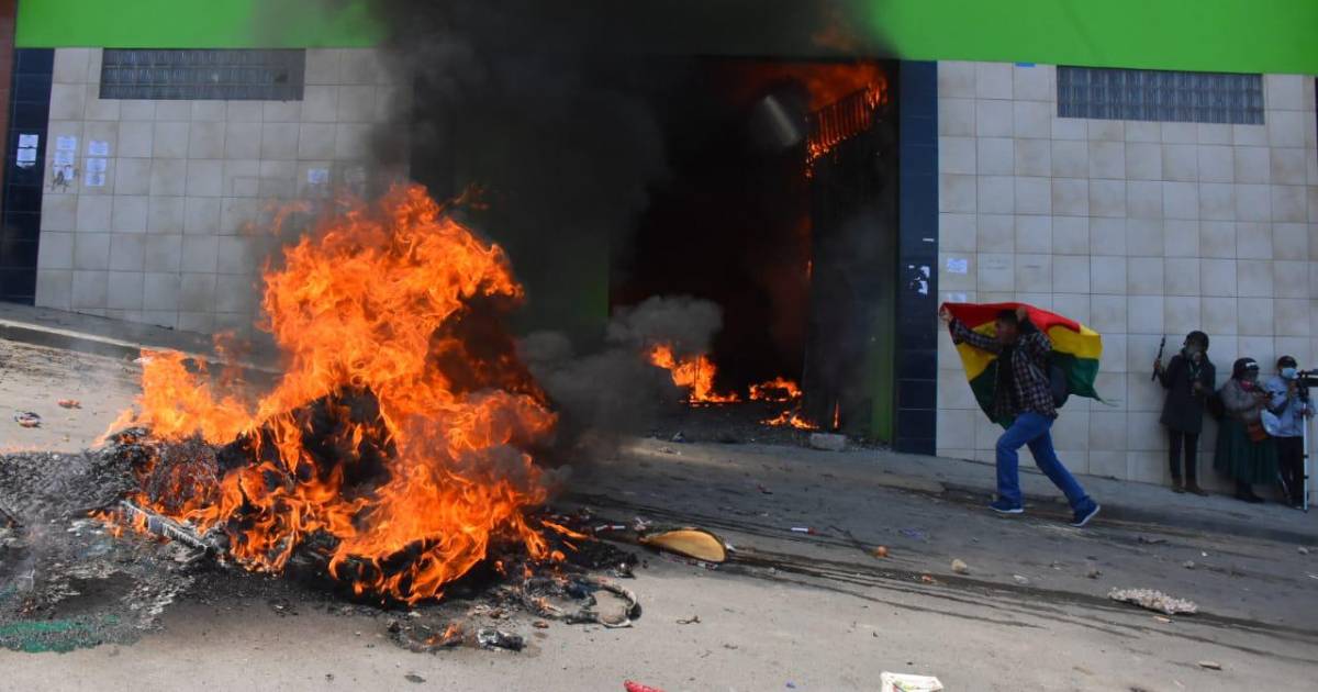 Tras la toma de la sede se produjo fuego al interior del mercado, un incendio que era celebrado por los socios de Adepcoca que habían batallado para poder ingresar a este recinto del que momentos antes, habían retirado taques de coca.