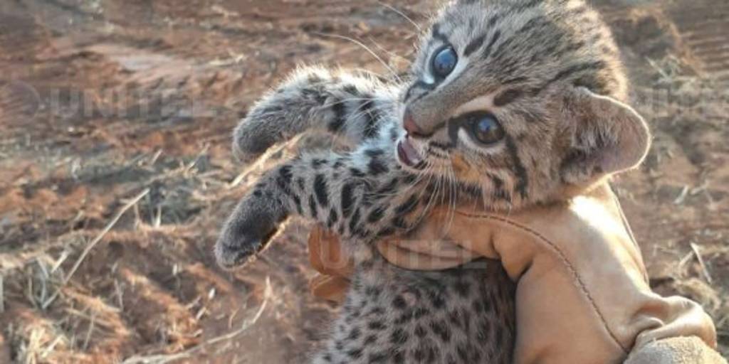 El bombero de la Gobernación de Santa Cruz, Alejandro Amutari, rescató a una cría de jaguar que se perdió en medio del incendio de la comunidad San Bartolo del municipio de San Ignacio de Velasco.