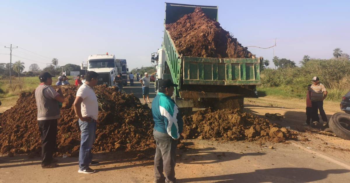 Desde las 00:00 de este lunes está bloqueada la carretera que une a la capital cruceña con Ascensión de Guarayos, en la vía a Trinidad, luego de que transportistas de San Julián y Okinawa instalaran esta medida de presión en reclamo por la construcción del tramo carretero Okinawa - Los Troncos.