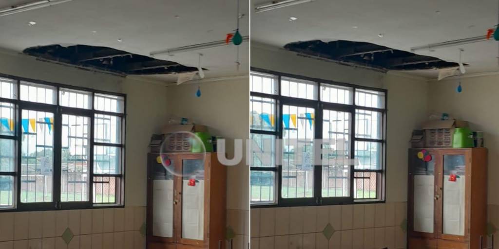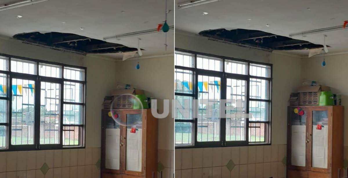 Después del hecho, personal del establecimiento educativo realizó el levantamiento de los escombros que estaban sobre los pupitres. Mientras el techo quedó con una especie de hueco.