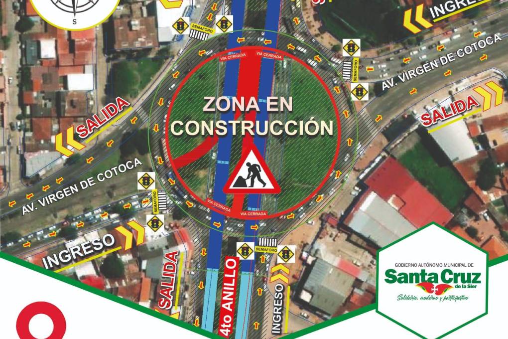 Desde este lunes 10 de julio, las vías del cuarto anillo y avenida Virgen de Cotoca serán cerradas para la construcción del viaducto de la zona. Aunque, los trabajos comenzaron hace una semana, solo con el cerrado perimetral de la rotonda.