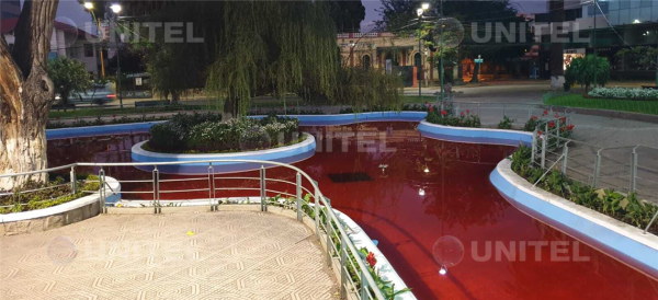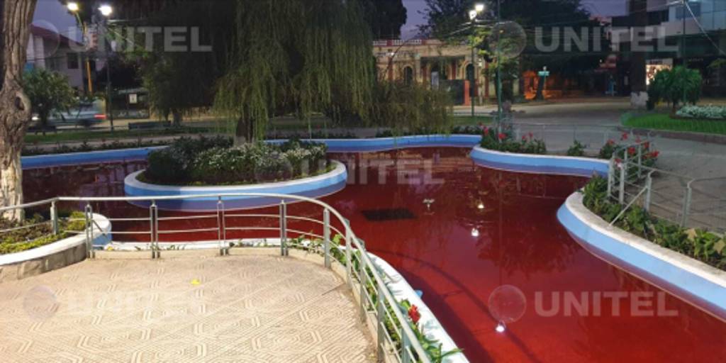 Tiñen de rojo el agua de la fuente en la plaza Colón de Cochabamba