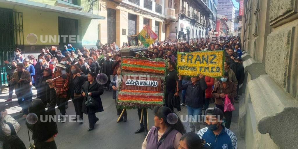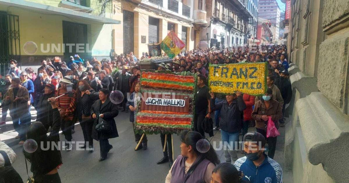 La tarde de este miércoles, los integrantes de Jach’a Mallku recorren las calles de Las Paz y sobre sus hombros llevan el ataúd del líder de su agrupación, Franz Chuquimia. Mientras una banda toca melodías de morenada.