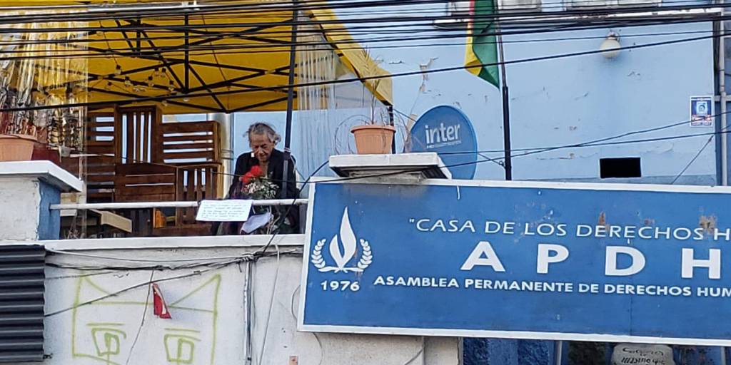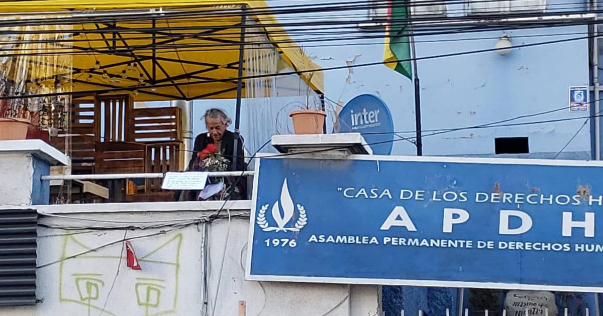 Amparo Carvajal cumple ocho días de vigilia en la terraza de la Asamblea Permanente de Derechos Humanos de Bolivia (Apdhb) y asegura que permanecerá en estas instalaciones hasta recuperar las oficinas que fueron despojadas de manera violenta hace más de 40 días por un grupo paralelo.