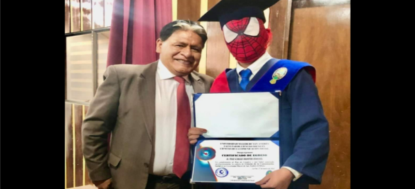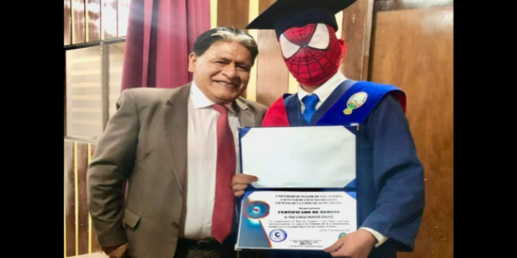Universitario usó una máscara de Spider-man para recibir su certificado de egreso de la carrera de Comunicación Social de la Universidad Mayor de San Andrés (UMSA).