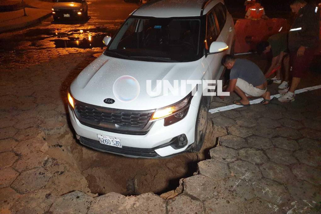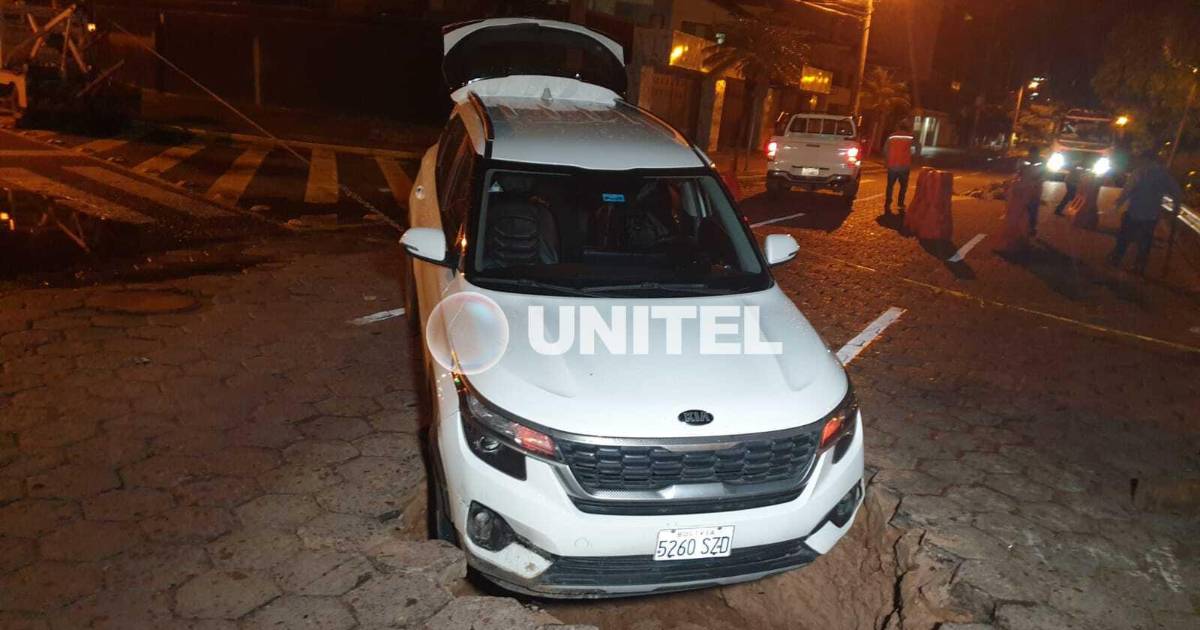 Un vehículo estuvo a punto de caer dentro de un enorme agujero que se formó sobre la avenida La Salle, a pocos metros de llegar al segundo anillo de la capital cruceña. El incidente se registró la noche de este jueves, luego de que se registrara una intensa lluvia en la ciudad.
