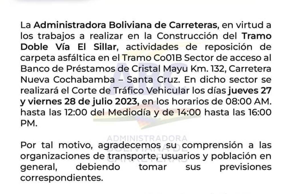 La Administradora Boliviana de Carreteras (ABC) confirmó que el cierre es tanto para los vehículos livianos como del transporte pesado en el tramo de la doble vía Sillar entre Cristal Mayu y Padresama por la reposición de la capa asfáltica a la altura del kilómetro 132.