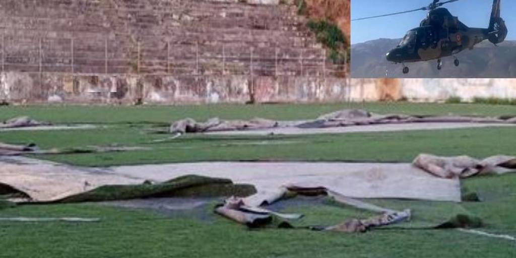 En las imágenes se observa que, las fuertes ráfagas de viento generado por las hélices del helicóptero provocaron que gran parte del césped sintético termine desprendido del piso.