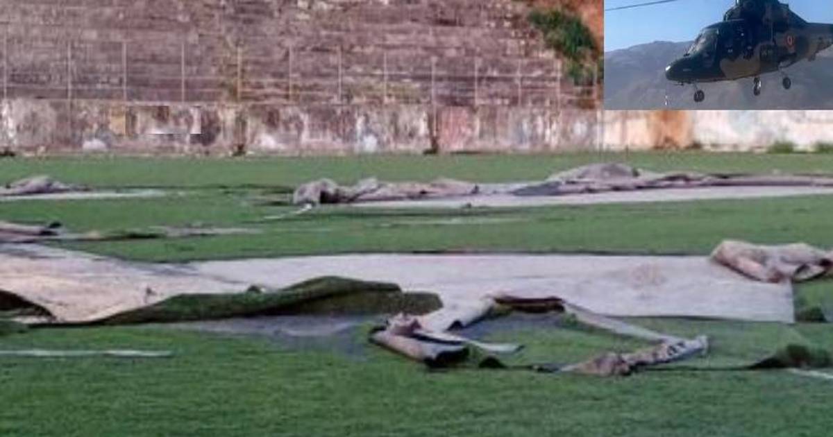 Video: Helicóptero intentó aterrizar en cancha de césped sintético en Coroico provocando destrozos