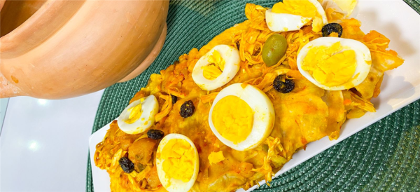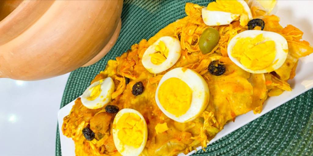 Con el aceite de urucú, la cebolla y los tomates rallados, hacer un ahogado y reservar la mitad para la última parte de la preparación. Con el ahogado que queda freír en la sartén la gallina ya hervida y desmenuzada, de a poco incorporar pequeñas cantidades del caldo, junto con las uvas pasas, las papas, los plátanos picados y cocidos, los huevos duros y las aceitunas.