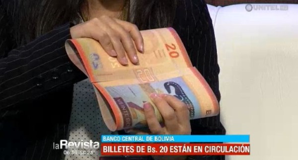 Claudia Soruco, subgerente de análisis del Banco Central, describió las características del nuevo corte de billetes de Bs. 20, el cual mantiene los detalles de tres personajes históricos, un sitio patrimonial en el anverso y otro en el reverso, los personajes que van en este billete son Genoveva Ríos, Tomás Katari y Pedro Ignacio Muiba, estos nuevos billetes ya están en circulación y los modelos antiguos siguen vigentes.