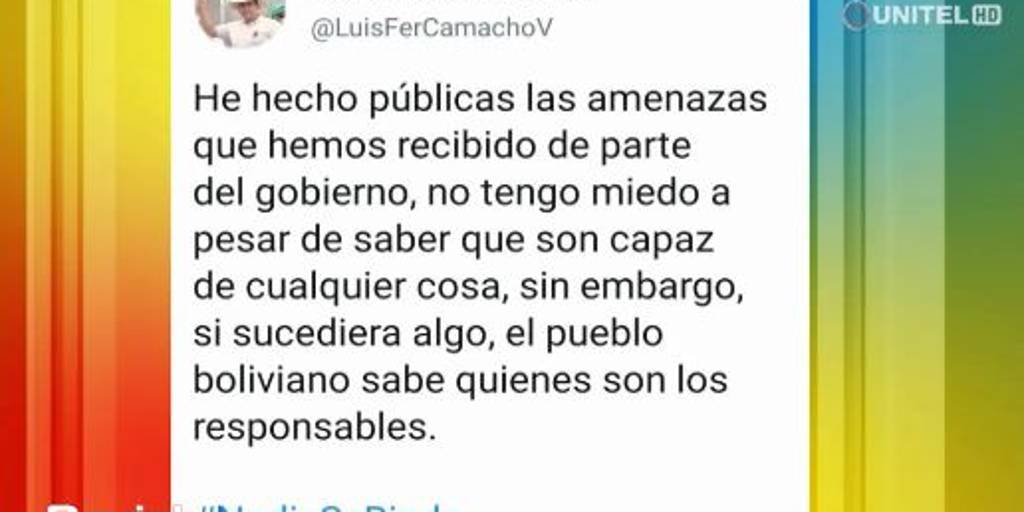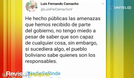 El presidente del Comité Cívico de Santa Cruz, Luis Fernando Camacho, envió un twit donde hace referencia a presuntas amenazas.