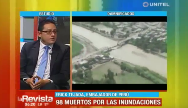 El cónsul Erick Tejada dio su punto de vista en referencia a la decisión del presidente del Perú de retirar a su embajador de Venezuela, además, indicó que ya son más de 90 los fallecidos a causa del fenómeno del 'niño costero' que azota a este país, afirma que están realizando un festival en baile en La Paz para poder recaudar fondos.