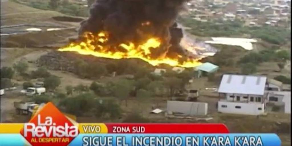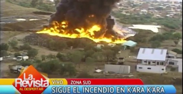 Sucede en la zona de K'ara K'ara de la zona sur, donde las llamas tienen asustados a los vecinos quienes temen que el fuego se propague. Los vecinos piden que la empresa que tiene el depósito en el lugar, salga de la zona y que los Bomberos actúen.