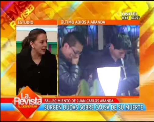La Paz, 7 de agosto de 2015.- Mireya Martínez Aranda e Israel Martínez Aranda estuvieron en La Revista donde dieron a conocer las circunstancias en las que falleció el vocalista de Irreversible, Juan Carlos Aranda quien se habría sometido a una cirugía plástica sin comunicarlo a su familia. Ellos tienen dudas de la causa de muerte, que en el certificado de defunción figura como un paro cardiorespiratorio por trombo embólico pulmonar.