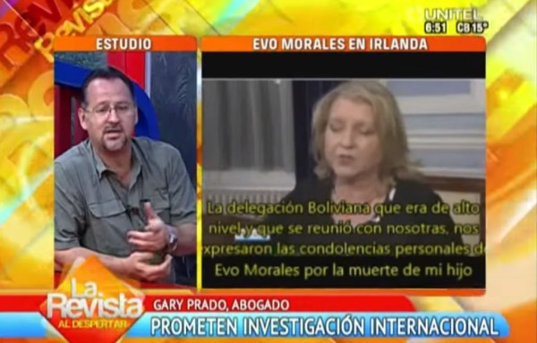 Gary Prado, abogado defensor de uno de los involucrados en el Caso Terrorismo, estuvo en La Revista donde señaló que para que se pueda desarrollar una investigación internacional como la que prometió el canciller Choquehuanca a la madre de Michael Dwayer, se tendría que poner en duda lo que antes hizo Marcelo Sosa. Relevó que desde el año 2009 los resultados de la autopsia del irlandés están en manos de la cancillería, pero que ésta no la ha derivado a las instancias que corresponden.