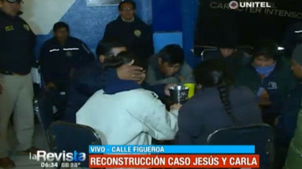 Al promediar las 4:15 de la madrugada de este jueves, empezó la reconstitución del caso Carla Bellot y Jesús Cañisaire, que se suscitó el pasado 1 de enero de 2018, tras asistir al festejo de año nuevo en una discoteca del centro paceño, en la reconstrucción están presentes, Israel León Fernández y su pareja Estefani Guisada, Eliot León Fernández, Micaela León Fernández y su pareja Renzo Cáceres, imputados por el asesinato de Carla y Jesús, además, por feminicidio y violación contra la joven de 25 años, mientras que la pareja de Eliot, Priscila es acusada de complicidad.