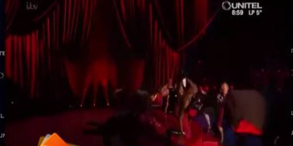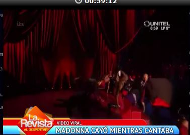 La reina del pop cayó en plena actuación durante la ceremonia de los premios Brit mientars cantaba su tema Living for Love.