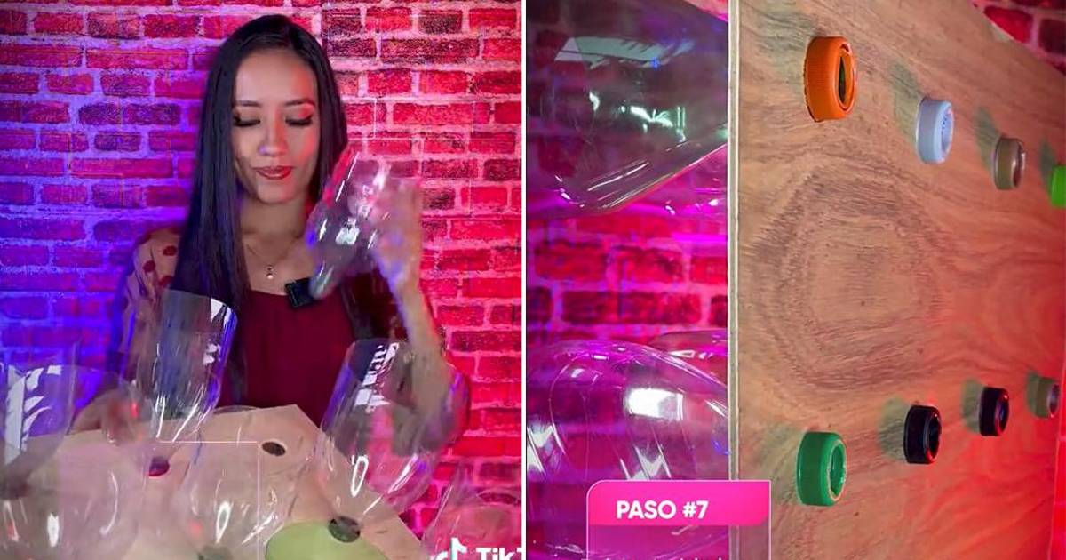 El prototipo está fabricado con botellas de plástico de dos litros cortadas a la mitad y dispuestas en cuadriculas.