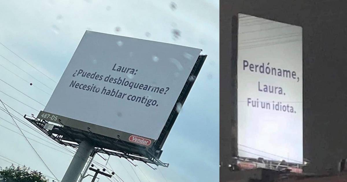 “Laura: Ella y yo solo somos amigos”; “¿Puedes desbloquearme? necesito hablar contigo”; “Perdóname Laura. Fui un idiota”, son algunos de los mensajes que se leen en las fotos de gigantografías que se viralizaron en las redes sociales desde las últimas horas.