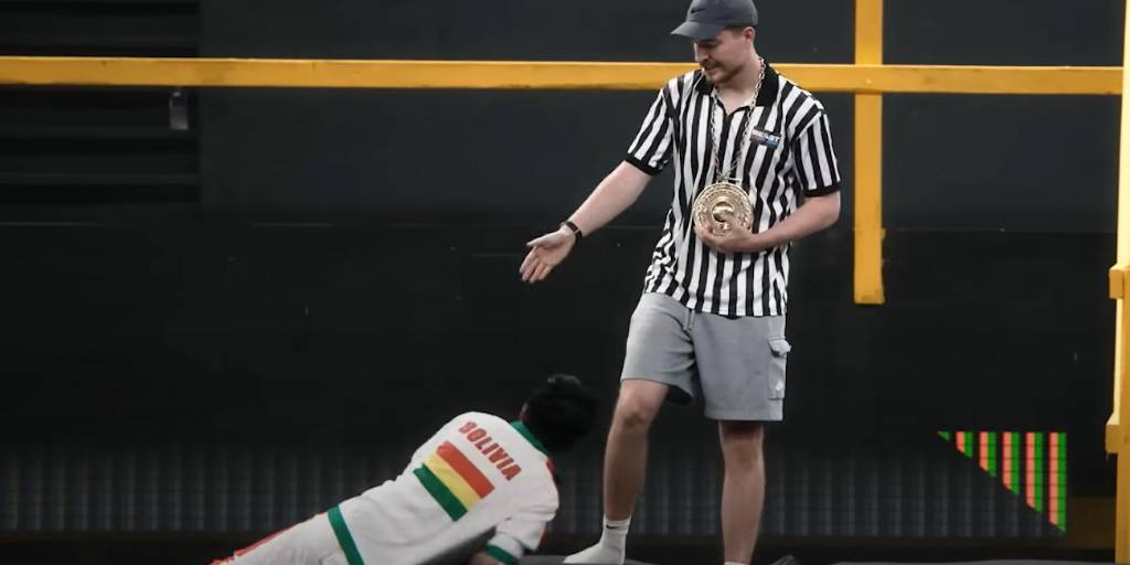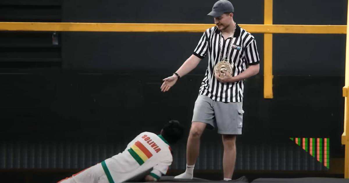 “Los traje a todos a Estados Unidos para competir en la versión más extrema de los Juegos Olímpicos”, explica MrBeast. Entre los participantes se observa a una persona que utiliza la vestimenta oficial con la bandera y el nombre de “Bolivia”.