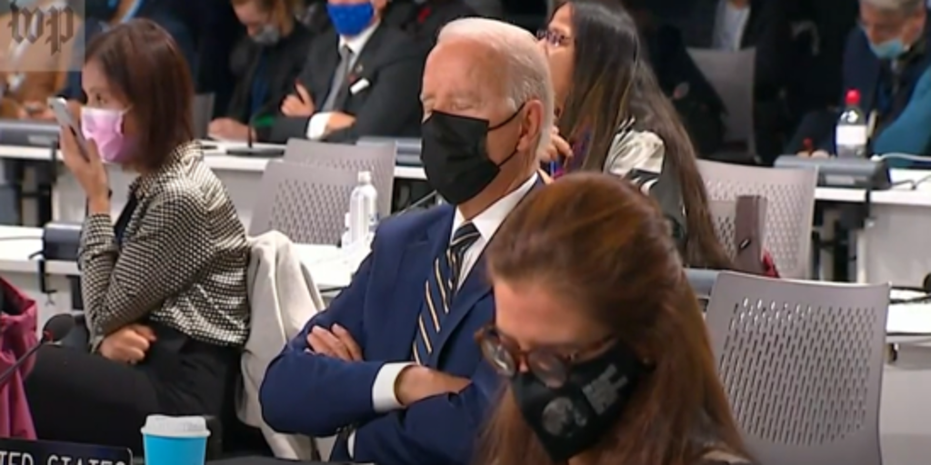 El presidente de los Estados Unidos vuelve a ser viral en las redes sociales de todo el mundo tras quedarse dormido en un la COP26, Conferencia de las Naciones Unidas sobre el Cambio Climático de 2021 que se celebra en Glasgow (Escocia) Biden no pudo resistir uno de los discursos de los altos mandatarios que participan en el evento, y cayó en un apacible sueño.