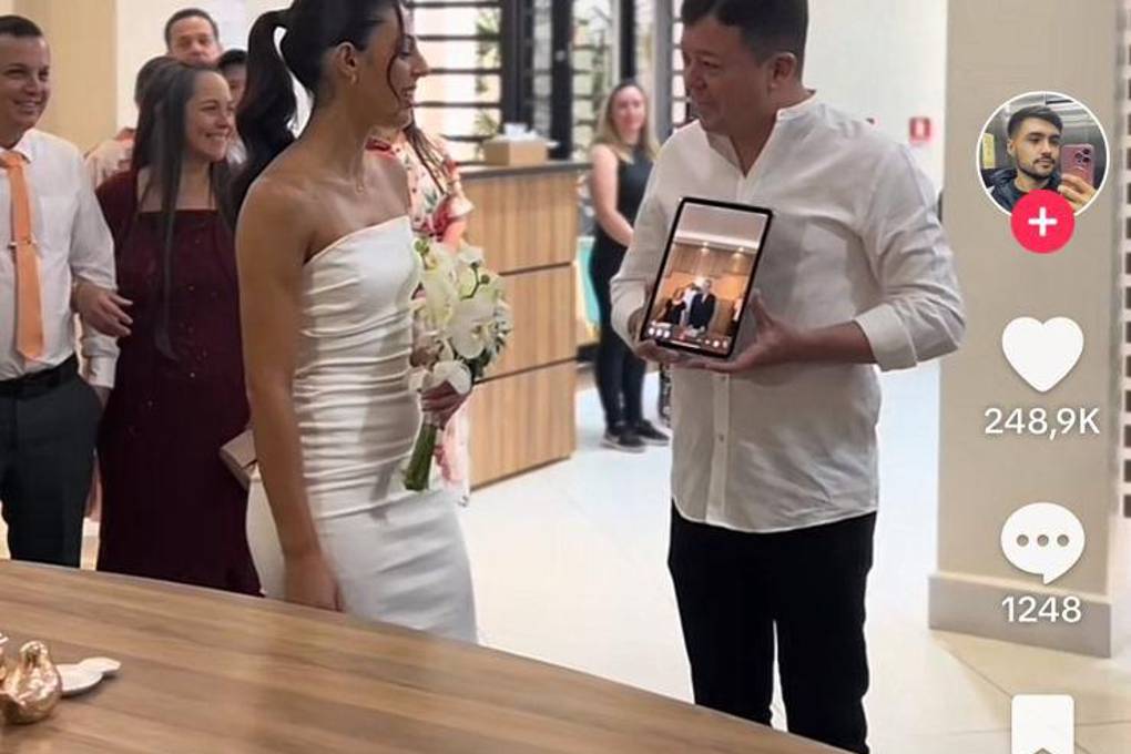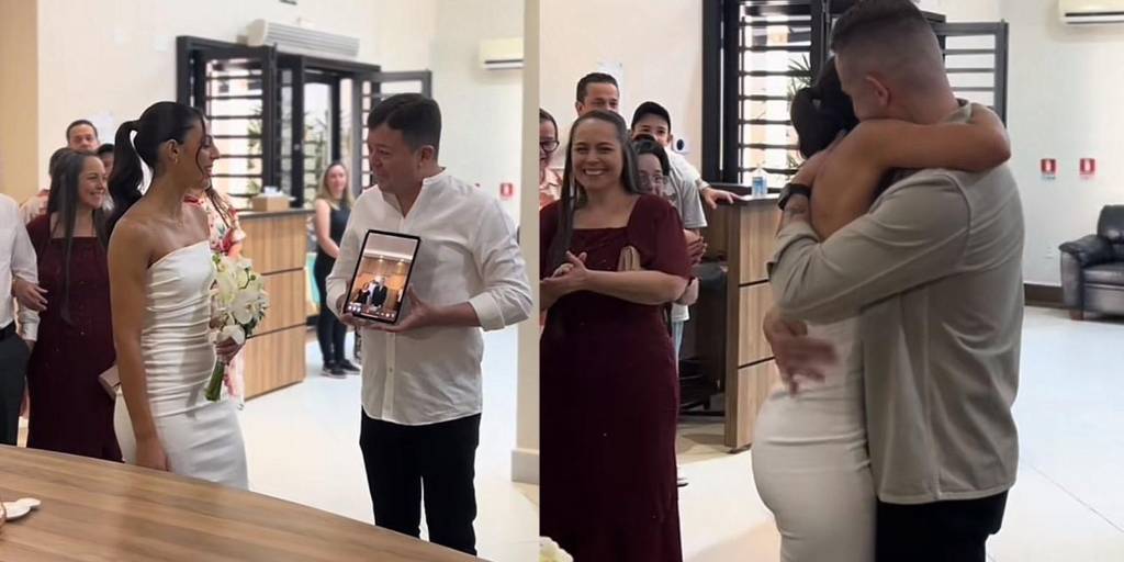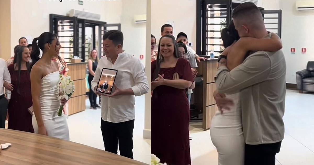 Con su vestido blanco, un ramo de flores, Giovana estaba lista para dar el “Si”, por videollamada, la ceremonia dio inicio cuando Danilo llamó, con lágrimas en los ojos la novia se arreglaba para ver a su pareja en la pantalla, un silencio incómodo se generó en la sala, mientras se esperaba la respuesta de Danilo. En medio del suspenso el novio apareció en el lugar de la boda, con una sonrisa impactó a todos los asistentes de la boda.