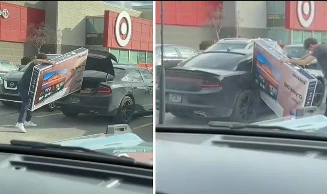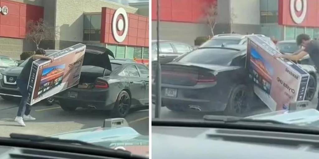 El hombre sale de un supermercado, abre el maletero, trata de meter el televisor de importantes pulgadas, y al no lograrlo, busca la segunda opción, el asiento trasero de su auto, pero tampoco logra irse a casa con su nueva compra.