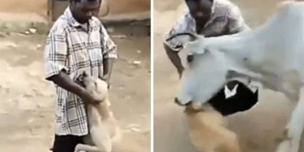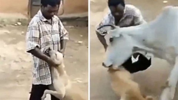 Una vaca se convierte en heroína al rescatar a un cachorro que estaba siendo torturado por un hombre