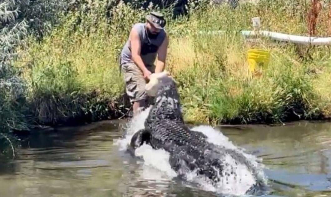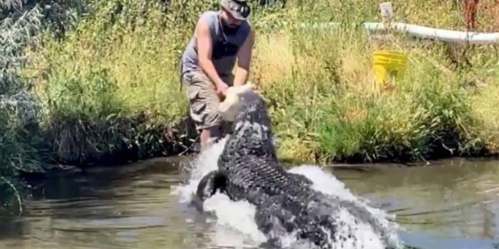 Hombre se salva de milagro tras tardarse en darle la comida a un cocodrilo gigantesco