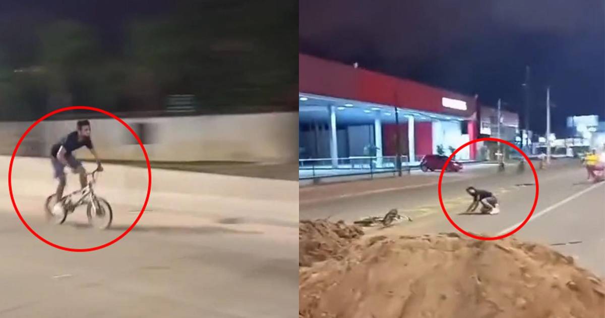 Sin embargo un joven se arriesgó a circular por estos lugares y peor a bajar a toda velocidad, lo que provoca que sufra una tremenda caída, como se puede observar en un video que circula por TikTok.