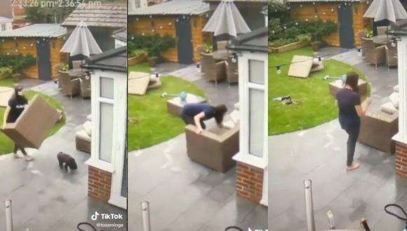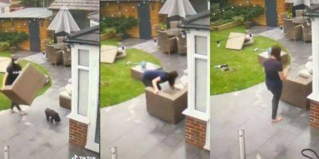 Para empezar, las cámaras de seguridad están puestas en el jardín trasero de la casa de la mujer. Desde dicho ángulo, las imágenes muestran a la mujer, moviendo u acomodando los muebles en el patio.