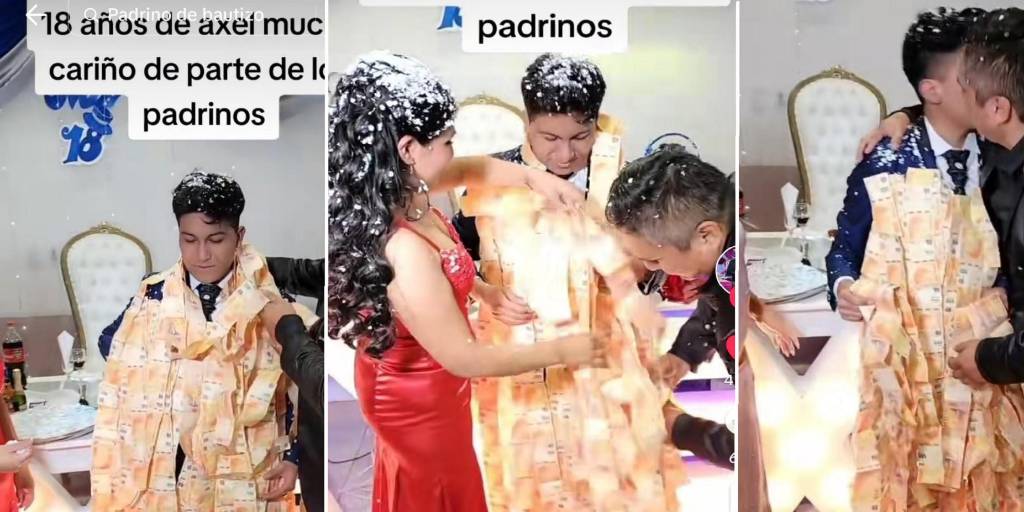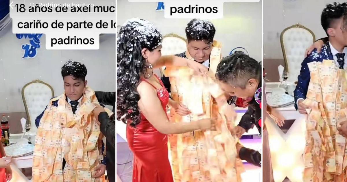 Sin embargo, el momento de entrega de regalos no concluye, hubo más. “A falta de bufanda para que no le haga frío se tapa con dinero”, dice el presentador en tono de broma mientras los padrinos siguen prendiendo billetes en el traje del joven.