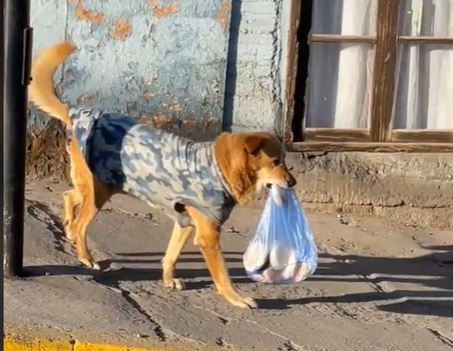 El animal fue captado con una bolsa recorriendo varias calles hasta llegar a su destino, la tierna escena conmovió las redes sociales