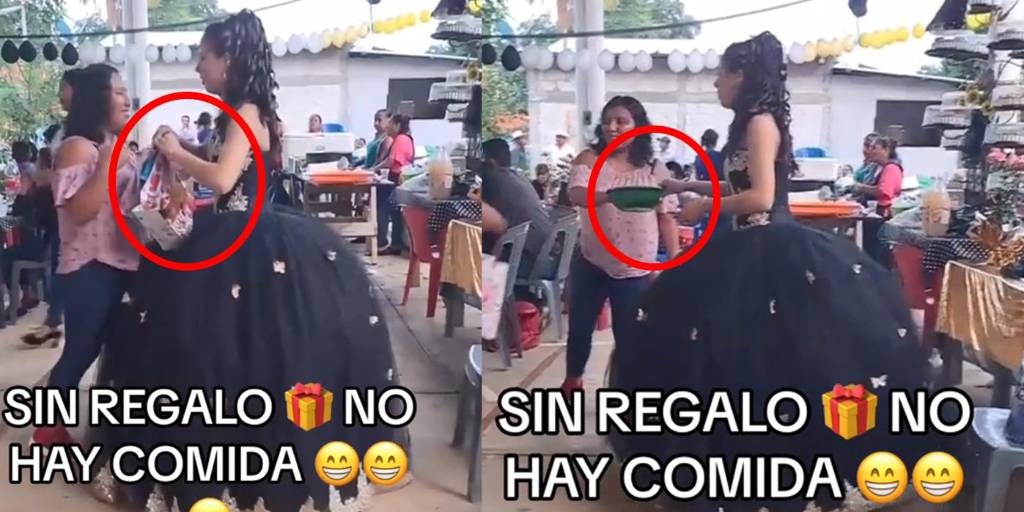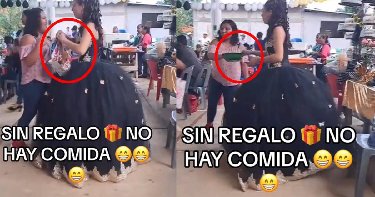Como si se tratara de una broma, una quinceañera generó una ola de reacciones con una polémica regla que al parecer debieron cumplir sus invitados. “Si no hay regalo no hay comida”, señaló en un video en el que se ve a la joven recibiendo obsequios, pero también entregando una bandeja para comer.