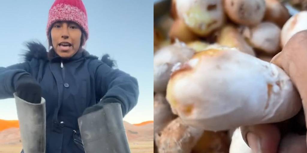 “Estos son los primeros chuños, miren están ‘congeladísimos’, esto va a ser nuestro almuerzo de hoy, para que este así de duro, pasa un proceso”, explicó enseñando lo sólido que quedó el chuño. También resaltó que para hacer el chuño necesitarían botas.