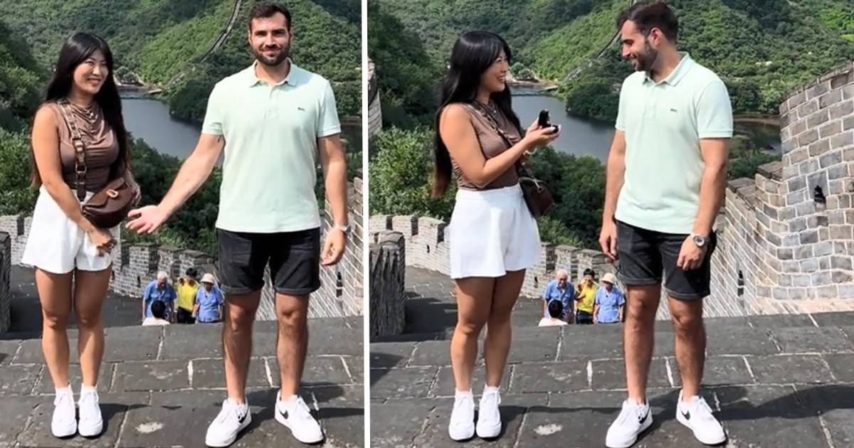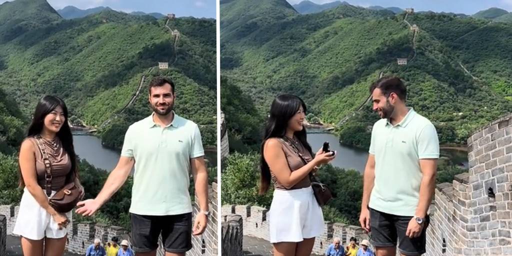 La Gran Muralla China fue el escenario donde la joven sacó un anillo para hacerle la propuesta a su novio, quien aceptó casarse con ella. El momento se viralizó en redes sociales pero también despertó los comentarios de algunas personas que utilizaron su video para criticarla además de dejar mensajes donde le señalaban que era su pareja quien debió pedirle matrimonio.