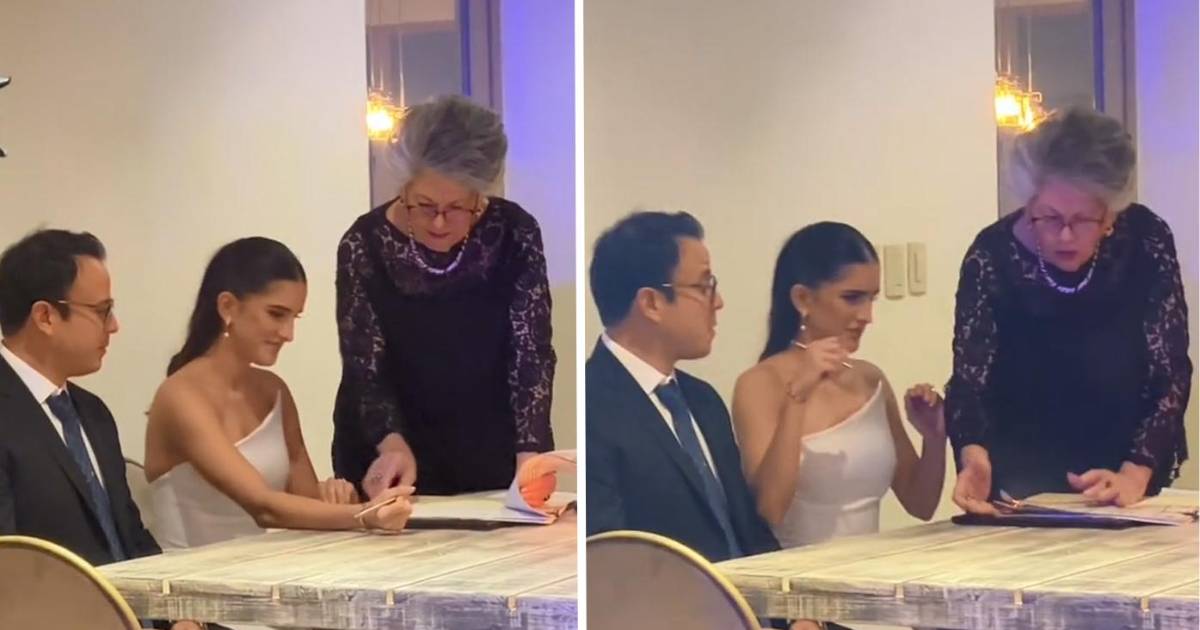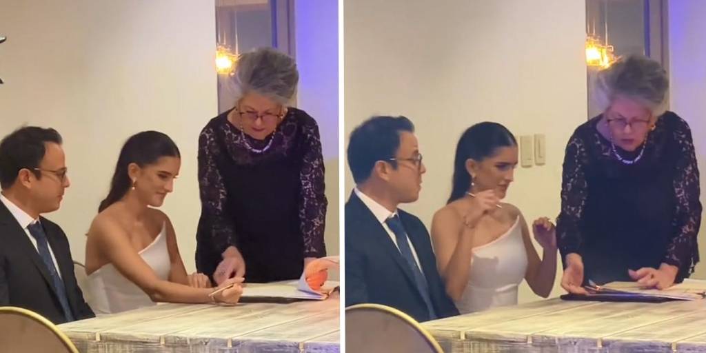 Según un video que se muestra en TikTok desde la cuenta “mafriase”, la juez del registro civil indicaba las hojas donde la mujer debía firmar, pero una vela decorativa que se encontraba cerca de los documentos comenzó a incendiar los papales.