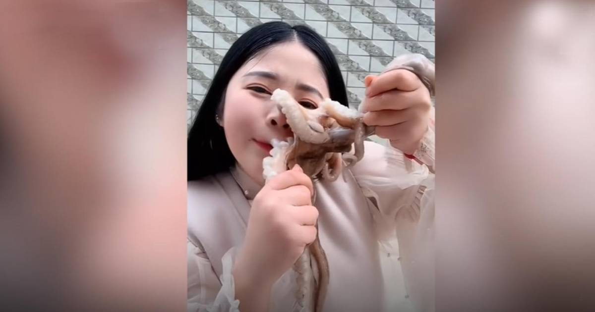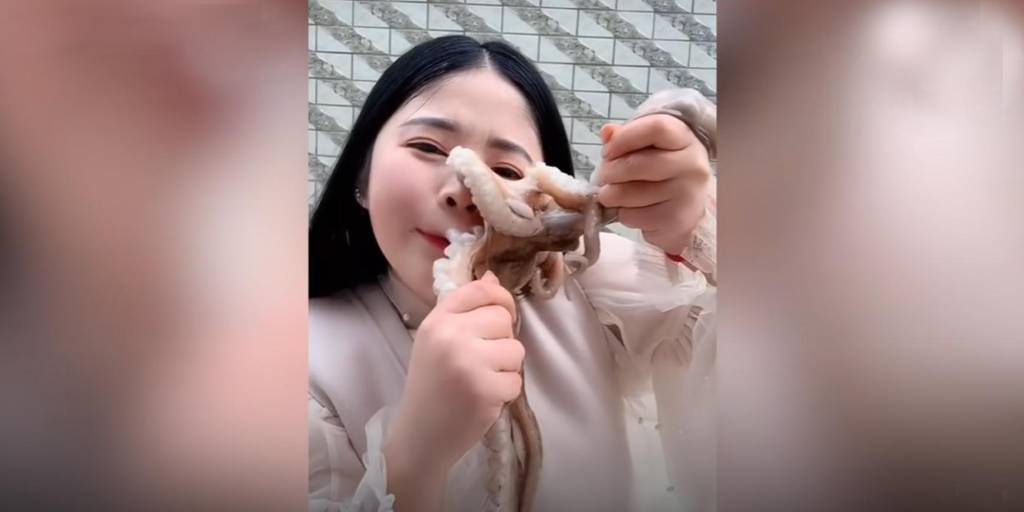 La joven conocida como “La chica de la playa Pequeña Seven” suele grabarse comiendo animales de mar vivos, entre ellos cangrejos y moluscos, pero al ver que no conseguía los resultados esperados, decidió filmarse comiendo un pulpo en la red social china “Kuaishou” sin pensar que esto le traería terribles consecuencias.