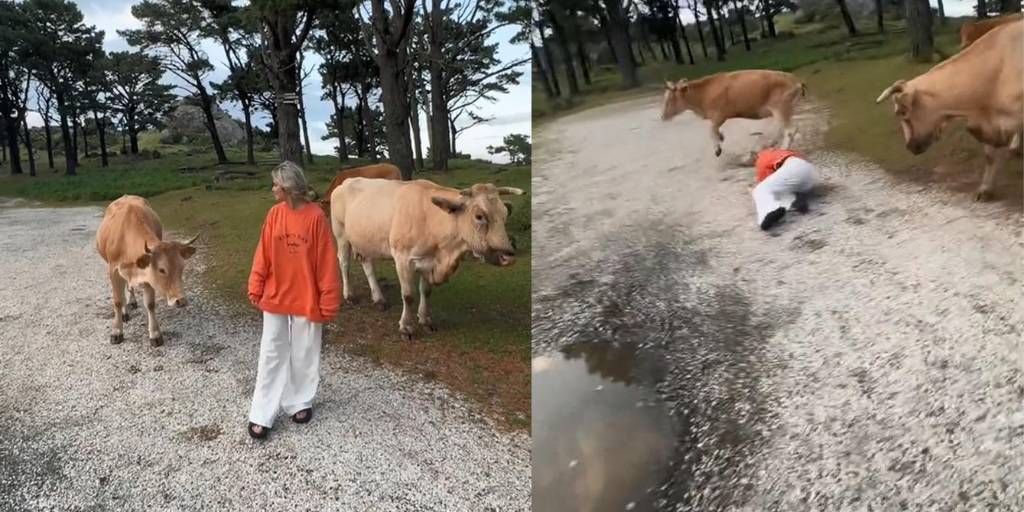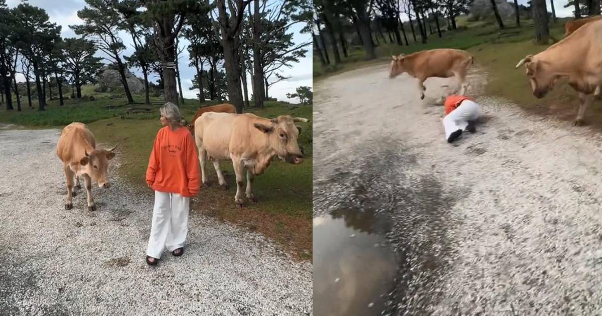 Desde la cuenta “noemartosr” se ve a una joven que pasea por el campo y encuentra unas vacas. Al parecer la mujer, también se encontraba acompañada por una persona, por lo que decide posar para que le tomen una fotografía con los animales, pero de forma inesperada una de las vacas le da un cornazo por la espalda.