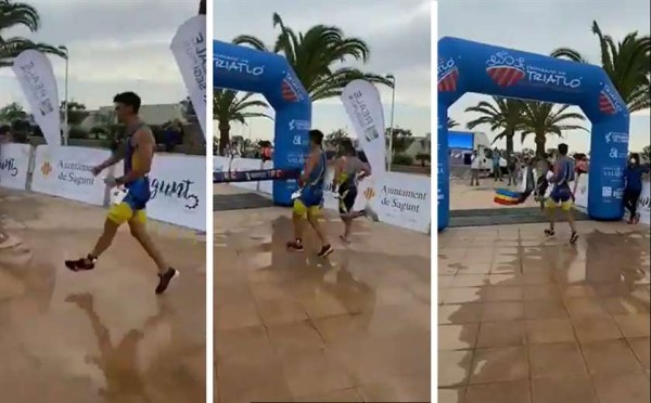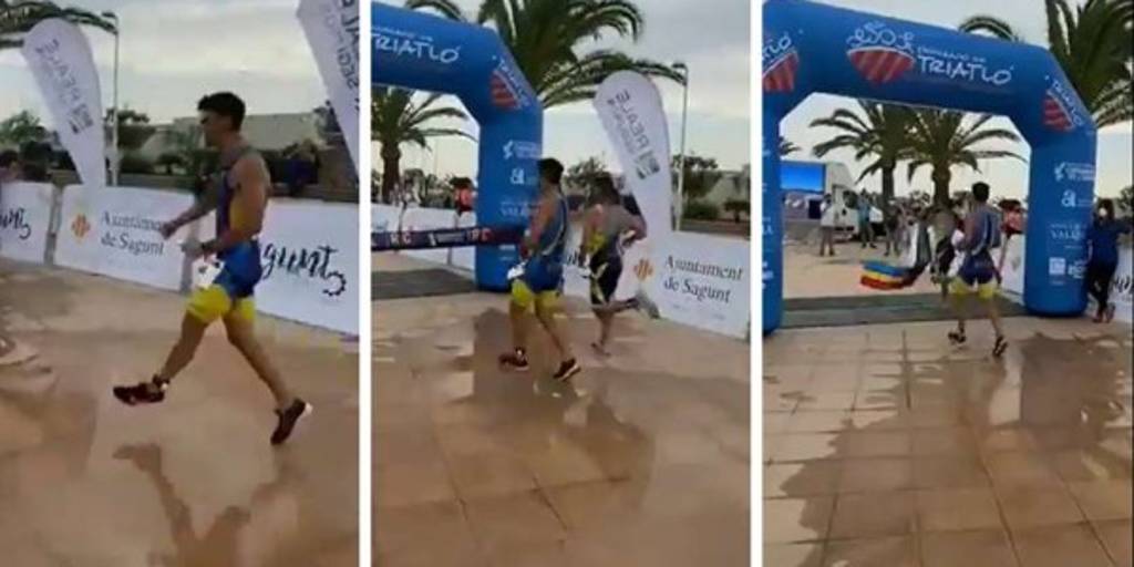 Mateo Bustos aprendió la lección de no celebrar una victoria antes de tiempo, un video que se ha vuelto viral en Twitter lo deja claro. El atleta estaba primera en el Triatlón de Sagunto (España), y por celebrarlo, otro competidor le ganó a a cerca de un metro de la meta.