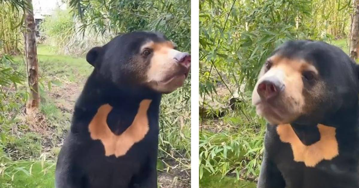 De acuerdo a los expertos del lugar, los osos malayos parecen “humanos” cuando están de pie, pero pararse de dos patas forma parte de su comportamiento natural. Añadieron que también intentan intimidar a sus enemigos mostrando el parche en el pecho si se sienten amenazados”.