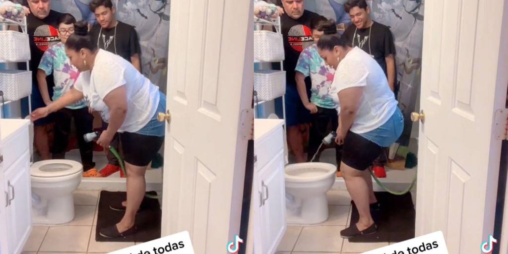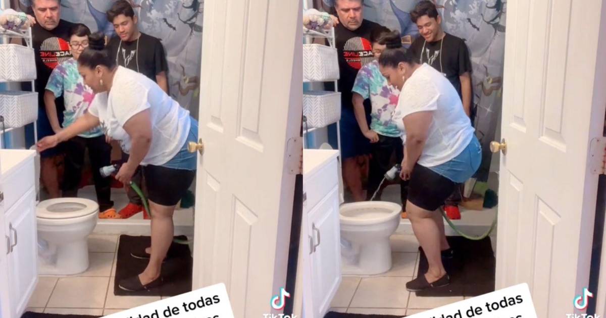 Con mucha paciencia una mujer enseño a los hombres de la casa como utilizar el baño correctamente, el video se volvió viral
