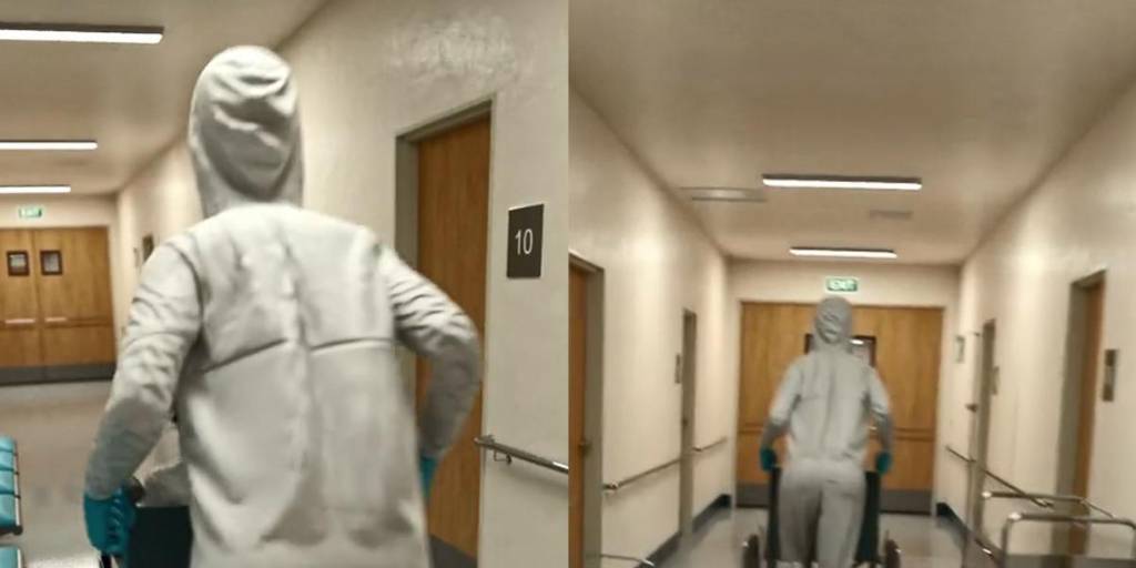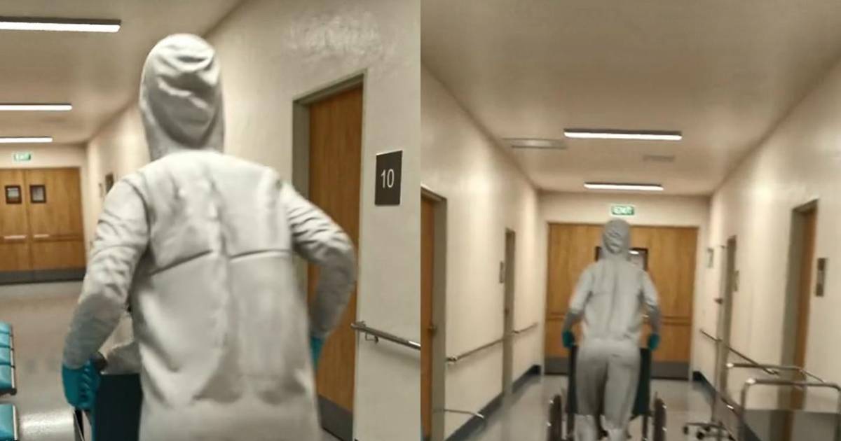 La grabación muestra a una “enfermera” con una indumentaria especial cubierta de pies a cabeza, pero lo más impresionante es que empuja en una silla de ruedas a un supuesto alienígena por los pasillos de lo que parece ser un hospital.