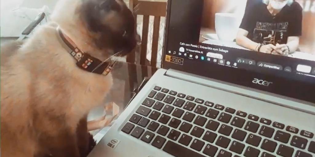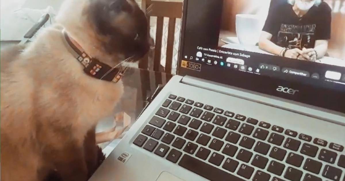 Las imágenes muestran a Tina (nombre de la gatita) mirando fijamente la pantalla de una computadora, donde aparece el tutor de la gatita, el músico y periodista Sebage, fallecido en octubre de 2022 a los 61 años.