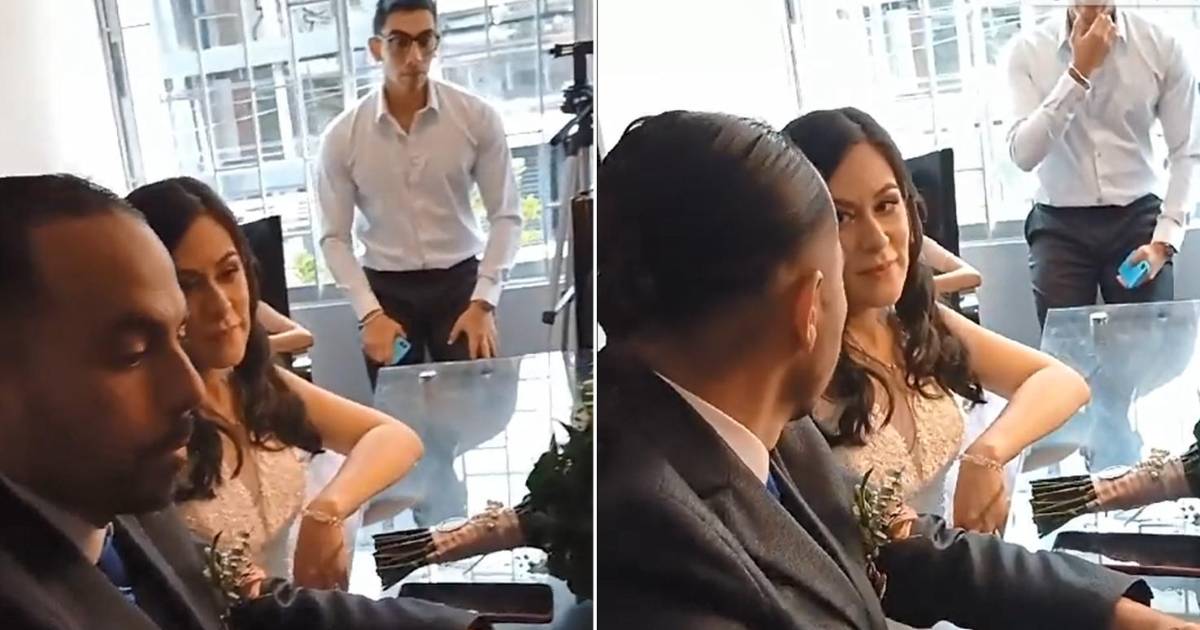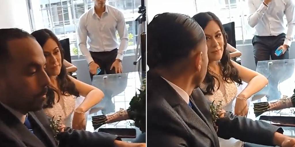 La pareja se estaba dando el “sí acepto” por lo civil el notario una vez leídas las condiciones señala que procederá con la ceremonia. “Jorge Enrique ¿Acepta casarse con Karol Johana?”, le dice el profesional a lo que él responde que sí. Sin embargo, cuando le hace la misma pregunta a la novia, esta sorprende con su respuesta.